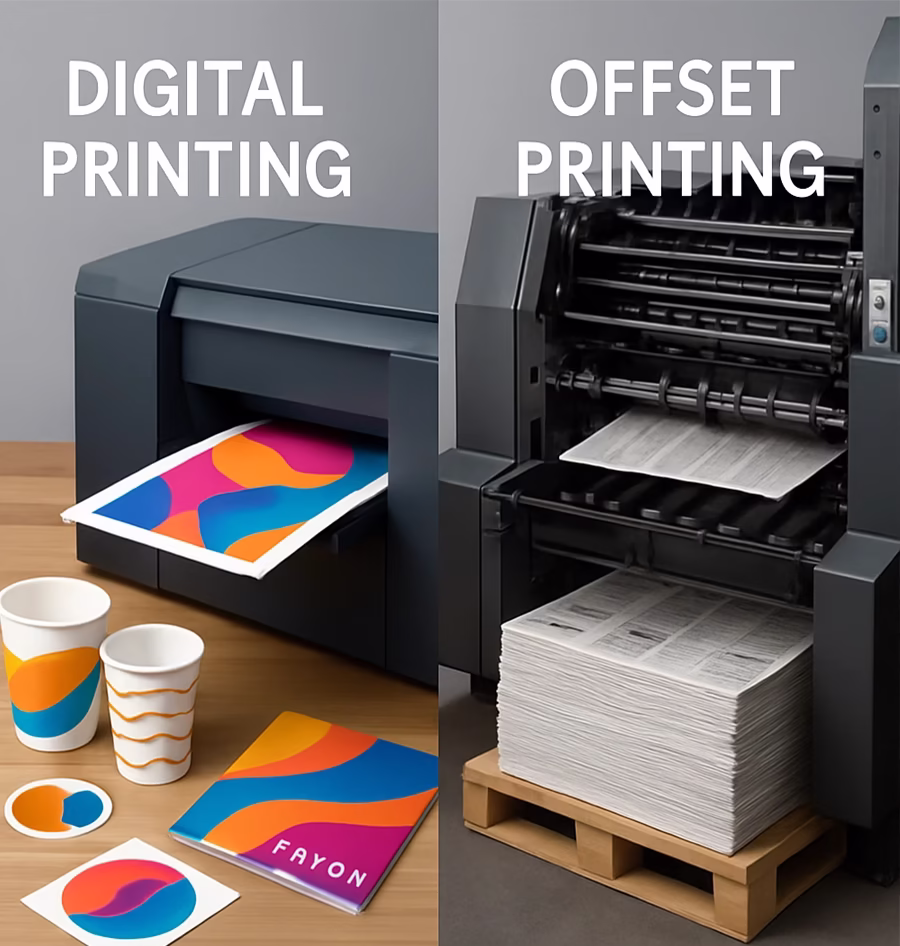 • الأوفست تقدم نطاقًا أوسع من الألوان وبدائل الورق، بينما توفر الطباعة الرقمية دقة ممتازة وسرعة إنجاز أكبر.